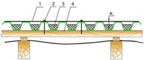 По стропилам на уложенный гидроизоляционный материал прибиваются стропильные планки толщиной 40…50 мм, а к ним — антисептированные доски обрешетки. Особенности укладки профнастила в зависимости от угла наклона кровли показаны в таблице 3.