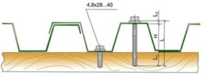 Крепление профнастила между собой и к обрешетке следует выполнять самонарезающии винтами с цинковым покрытием и с уплотнительной шайбой из неопреновой резины. Для крепления профнастила к обрешетке в нижнюю гофру используются саморезы 4,8х2,8…40. При монтаже конька крепление его необходимо производить через верхнюю гофру, тогда длина самореза подбирается исходя из высоты профиля.