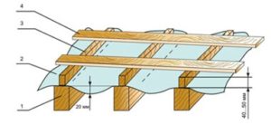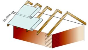Гидроизоляционную пленку укладывают горизонтально, от карниза к коньку с нахлестом 100…150 ммм и провисом пленки между стропилами около 20 мм, затем герметично соединяют внахлест с проклейкой стыков клейкой лентой (Рис. 3 и Рис. 4)