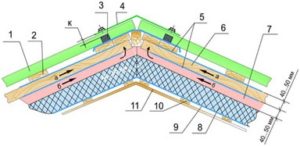 Для гидроизоляции подкровельного пространства нежилых строений можно использовать толь, рубероид, пергамин по обрешетке из досок 20…25 мм. Для проветривания подкровельного пространства между пленкой и обрешеткой нужно оставлять вентиляционный зазор 40…50 мм. Для беспрепятственного прохода воздушного потока через конек гидроизоляционная пленка должна не доходить до конька 40…50 мм (Рис. 5), а между коньком и уплотнителем конька необходимо оставить зазор “К”.