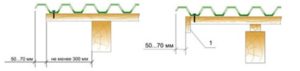 Горизонтальный и вертикальный нахлестпрофнастила при уклоне до 12˚ рекомендуется загерметизироватьтиоколовыми или силиконовыми герметиками. Карнизный свес устанавливается в зависимости от высоты профиля (таб. 2)
