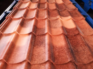 Щоб вибрати – металочерепицю або профнастил, проаналізуємо характеристики ще одного популярного будматеріалу. Виготовляють його з холоднокатаних марок сталі, яку профилируют на спеціальному верстаті. Він – більш тонкий, до 0,6 мм, і імітує по фактурі класичну кераміку.